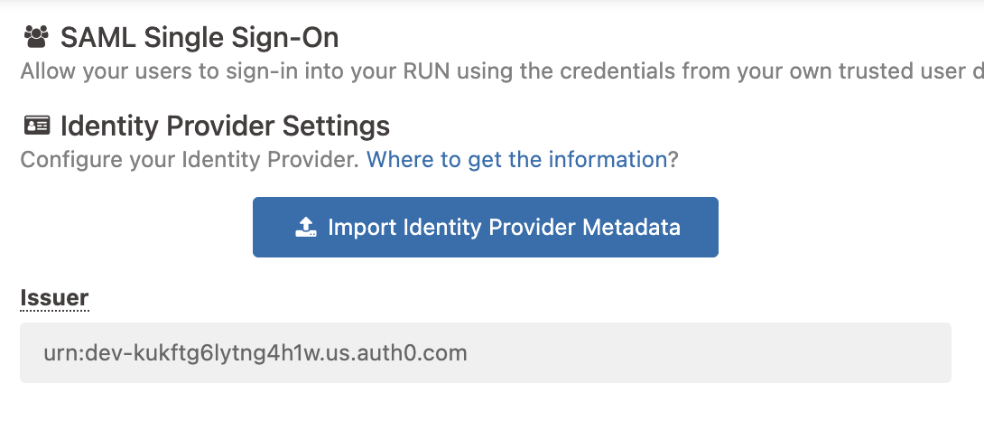 Import the metadata file in the RUN edit page (Admin > RUN > Integrations > Single Sign-on)